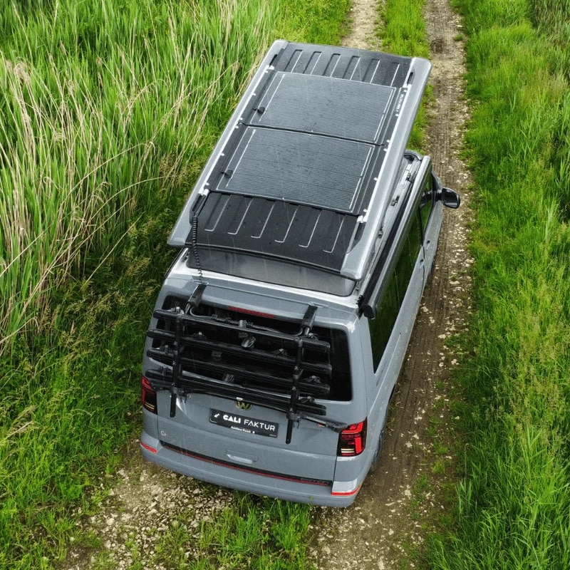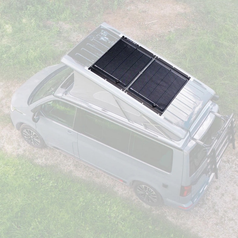 Das semi-flexible Solarmodul vereint Funktionalität und Stil. Mit seinem minimalistischen Design und der geringen Aufbauhöhe fügt es sich nahtlos in deinen VW California ein und bleibt dank doppel-ETFE-Technologie robust und witterungsbeständig. Die Höhe deines VW California bleibt unter 2 Metern.